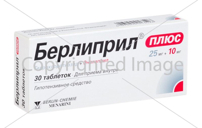 Препарат Берліприл ® плюс – це комбінований препарат, до складу якого входять еналаприл – інгібітор ангіотензинперетворюючого ферменту (АПФ) та гідрохлортіазид, тіазидний діуретик.
