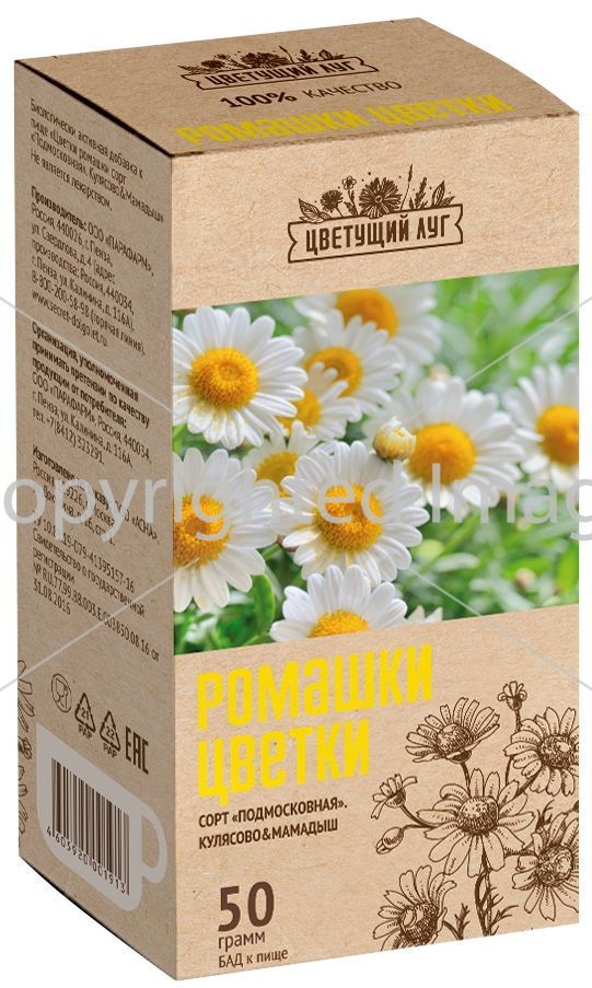 Производит Цветущий луг цветки ромашки 50г компания Парафарм. Само производство расположено в стране Россия.