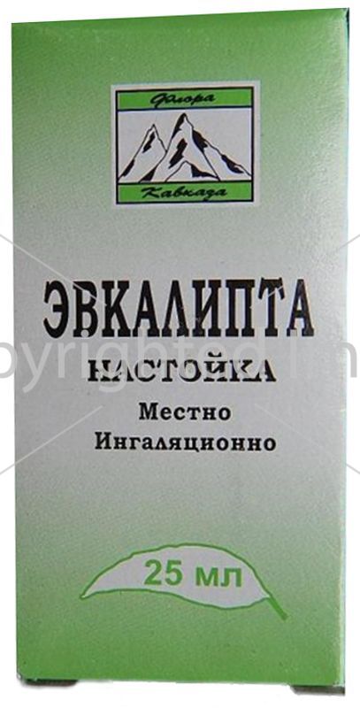 Склад, форма випуску та упаковкаНастоянка - 1л. Активні речовини: Евкаліпта прутоподібного листя – 200 г; Етанол (спирт етиловий) 70% - достатня кількість для отримання 1000 мл настойки. Настойка для інгаляцій та місцевого застосування. По 25, 40 мл препарату у флакони світлозахисного скла, закупорені поліетиленовими пробками або пробками-крапельницями, з кришками нагвинчувані або нагвинчуються з контролем першого розтину, або з алюмінієвими ковпачками, також допускається використання кришок і кришок-капель. На флакони наклеюють етикетку з паперу етикетковою, або письмовою, або етикетку, що самоклеїться. Кожен флакон разом з інструкцією з медичного застосування поміщають у пачку з картону. Допускається вкладення полімерної мірної ложки у кожну пачку. Допускається текст інструкції з медичного застосування наносити на картонну пачку. По 10, 16, 20, 30, 40, 56, 112 флаконів по 25, 40 мл з відповідною кількістю інструкцій з медичного застосування поміщають у картонну коробку або ящик з гофрованого картону (для стаціонарів). По 10, 18 кг у бутлі скляні або каністри поліетиленові (для виробничих відділів аптек). На бутлі та каністри наклеюють етикетку з паперу етикетковою, або письмовою, або для документів, або етикетку, що самоклеїться.Опис лікарської формиПрозора рідина зеленувато-коричневого кольору із характерним запахом.Фармакотерапевтична групаАнтисептичний засіб рослинного походження.ФармакодинамікаЧинить місцеву протизапальну, антисептичну дію.Показання до застосуванняУ комплексній терапії інфекційно-запальних захворювань глотки та верхніх дихальних шляхів (фарингіт, ларингіт, трахеїт), порожнини рота (стоматит, гінгівіт).Протипоказання до застосуванняПідвищена чутливість до компонентів препарату; дитячий вік до 3 років. Для інгаляцій – бронхіальна астма, бронхоспазм, кашлюк.Вагітність та лактаціяЗастосування препарату при вагітності та в період грудного вигодовування можливе, якщо очікувана користь для матері перевищує потенційний ризик для плода та дитини. Потрібно проконсультуватися з лікарем.Побічна діяМожливі алергічні реакції.Взаємодія з лікарськими засобамиЧи не описано.Спосіб застосування та дозиМісцево, інгаляційно. Для полоскань у дорослих та дітей старше 3 років використовують по 10-15 крапель на склянку води 3-4 рази на день; для парових інгаляцій – по 10-15 крапель на склянку води 1-2 рази на день. Курс лікування – 10 днів. При необхідності проводять повторні курси з двотижневими перервами (або без них) після консультації з лікарем.ПередозуванняВипадки передозування досі не зареєстровані.Запобіжні заходи та особливі вказівкиПри застосуванні препаратів, що містять евкаліптову олію, необхідно перевіряти індивідуальну чутливість; можливі алергічні реакції. Вплив на здатність до керування автотранспортом та управління механізмами У період застосування лікарського препарату необхідно дотримуватися обережності при виконанні потенційно небезпечних видів діяльності, що вимагають підвищеної концентрації уваги та швидкості психомоторних реакцій (у тому числі, керування транспортними засобами, робота з механізмами, що рухаються).Умови зберіганняПри кімнатній температуріУмови відпустки з аптекБез рецептаВідео на цю тему