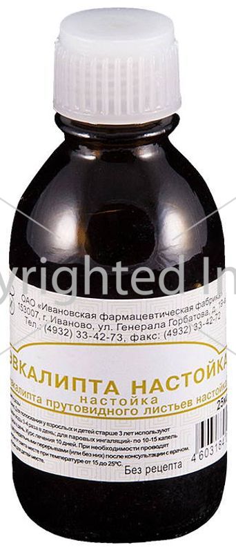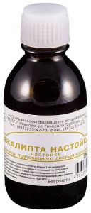 Склад, форма випуску та упаковкаНастоянка - 1л. Активні речовини: Евкаліпта прутоподібного листя – 200 г; Етанол (спирт етиловий) 70% - достатня кількість для отримання 1000 мл настойки. Настойка для інгаляцій та місцевого застосування. По 25, 40 мл препарату у флакони світлозахисного скла, закупорені поліетиленовими пробками або пробками-крапельницями, з кришками нагвинчувані або нагвинчуються з контролем першого розтину, або з алюмінієвими ковпачками, також допускається використання кришок і кришок-капель. На флакони наклеюють етикетку з паперу етикетковою, або письмовою, або етикетку, що самоклеїться. Кожен флакон разом з інструкцією з медичного застосування поміщають у пачку з картону. Допускається вкладення полімерної мірної ложки у кожну пачку. Допускається текст інструкції з медичного застосування наносити на картонну пачку. По 10, 16, 20, 30, 40, 56, 112 флаконів по 25, 40 мл з відповідною кількістю інструкцій з медичного застосування поміщають у картонну коробку або ящик з гофрованого картону (для стаціонарів). По 10, 18 кг у бутлі скляні або каністри поліетиленові (для виробничих відділів аптек). На бутлі та каністри наклеюють етикетку з паперу етикетковою, або письмовою, або для документів, або етикетку, що самоклеїться.Опис лікарської формиПрозора рідина зеленувато-коричневого кольору із характерним запахом.Фармакотерапевтична групаАнтисептичний засіб рослинного походження.ФармакодинамікаЧинить місцеву протизапальну, антисептичну дію.Показання до застосуванняУ комплексній терапії інфекційно-запальних захворювань глотки та верхніх дихальних шляхів (фарингіт, ларингіт, трахеїт), порожнини рота (стоматит, гінгівіт).Протипоказання до застосуванняПідвищена чутливість до компонентів препарату; дитячий вік до 3 років. Для інгаляцій – бронхіальна астма, бронхоспазм, кашлюк.Вагітність та лактаціяЗастосування препарату при вагітності та в період грудного вигодовування можливе, якщо очікувана користь для матері перевищує потенційний ризик для плода та дитини. Потрібно проконсультуватися з лікарем.Побічна діяМожливі алергічні реакції.Взаємодія з лікарськими засобамиЧи не описано.Спосіб застосування та дозиМісцево, інгаляційно. Для полоскань у дорослих та дітей старше 3 років використовують по 10-15 крапель на склянку води 3-4 рази на день; для парових інгаляцій – по 10-15 крапель на склянку води 1-2 рази на день. Курс лікування – 10 днів. При необхідності проводять повторні курси з двотижневими перервами (або без них) після консультації з лікарем.ПередозуванняВипадки передозування досі не зареєстровані.Запобіжні заходи та особливі вказівкиПри застосуванні препаратів, що містять евкаліптову олію, необхідно перевіряти індивідуальну чутливість; можливі алергічні реакції. Вплив на здатність до керування автотранспортом та управління механізмами У період застосування лікарського препарату необхідно дотримуватися обережності при виконанні потенційно небезпечних видів діяльності, що вимагають підвищеної концентрації уваги та швидкості психомоторних реакцій (у тому числі, керування транспортними засобами, робота з механізмами, що рухаються).Умови зберіганняПри кімнатній температуріУмови відпустки з аптекБез рецептаВідео на цю тему