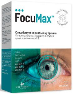 Властивості компонентівФокумакс містить комплекс каротиноїдів (лютеїн та зеаксантин) рослинного походження, амінокислоти (таурін) рослинного походження, вітаміни та мінерали. Вітамін А та цинк допомагають підтримувати нормальний зір, водночас цинк забезпечує нормальний метаболізм вітаміну А. Вітамін С допомагає відновити редуковану форму вітаміну Е. Активні речовини, що містяться в складі продукту, захищають сітківку від руйнівного впливу блакитного світла випромінюваного екранами електронних пристроїв (HEV-випромінювання), знижують ризик виникнення та розвитку вікових дегенеративних змін сітківки ока, а також мають протизапальні властивості.