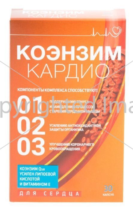 «Коензим Кардіо» - комплекс, що володіє посиленою дією, який поряд з коензимом Q10 включає ліпоєву кислоту і вітамін Е. Ретельно підібране поєднання цих речовин, необхідних для роботи серцево-судинної системи, сприяє усуненню їх дефіциту в організмі людини.