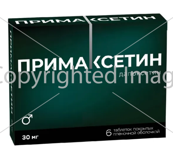 Протипоказання до застосуванняГіперчутливість до дапоксетину гідрохлориду або будь-якого іншого компонента препарату; виражені захворювання серця, зокрема. серцева недостатність II–IV класу за NYHA, порушення серцевої провідності (блокада атріовентрикулярної провідності ступеня 2–3 або синдром слабкості синуса) за відсутності постійного кардіостимулятора, виражена ішемічна хвороба серця або ураження клапанного апарату; одночасний прийом інгібіторів МАО та прийом протягом 14 днів після припинення їх застосування (аналогічно інгібітори МАО не можна приймати протягом 7 днів після припинення прийому препарату Прімаксетин®); одночасний прийом тіоридазину та протягом 14 днів після припинення його застосування (аналогічно тіорідазин не можна приймати протягом 7 днів після припинення прийому препарату Прімаксетин®); одночасний прийом СІОЗС, СІОЗСН та трициклічних антидепресантів та інших препаратів, що мають серотонінергічну дію (в т.ч. L-триптофан, триптани, трамадол, лінезолід, літій, препарати звіробою (Hypericum perforatum), та протягом 14 днів (аналогічно ці препарати не можна приймати протягом 7 днів після припинення прийому препарату Прімаксетин®); одночасний прийом з активними інгібіторами CYP3A4 (в т.ч. кетоконазол, ітраконазол, ритонавір, саквінавір, телітроміцин, нефазодон, нелфінавір, атазанавір); помірно виражені та тяжкі порушення функції печінки; тяжкі порушення функції нирок; дефіцит лактази, непереносимість лактози, глюкозо-галактозна мальабсорбція; наявність в анамнезі встановленої або передбачуваної ортостатичної гіпотензії; наявність в анамнезі манії/гіпоманії або біполярного розладу; вік до 18 років.