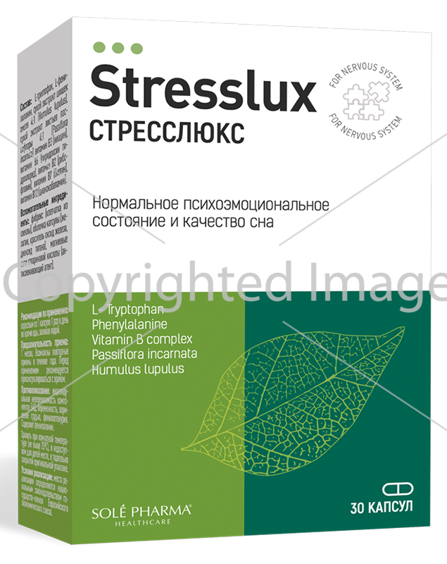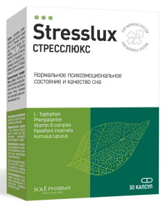 Стресслюкс - растительный комплекс с незаменимыми аминокислотами и группой витаминов B. Имеет накопительный эффект, поэтому действие более длительное! Пассифлора улучшает процессы мозгового кровообращения и обладает успокаивающим действием. Хмель обладает седативным действием, может использоваться для лечения и профилактики последствий стресса. L-триптофан непосредственно участвует в процессе формирования сна, способствует образованию веществ, регулирующих гормоны и биологические ритмы, а также продолжительность сна. L-фенилаланин позволяет успешно справляться с раздражением, чувством тревоги и снимает напряжение. Повышает обучаемость человека. Витамины группы B необходимы для нормальной работы центральной нервной системы, уменьшают тревожно-депрессивные состояния, нормализуют эмоциональное состояние и настроение.