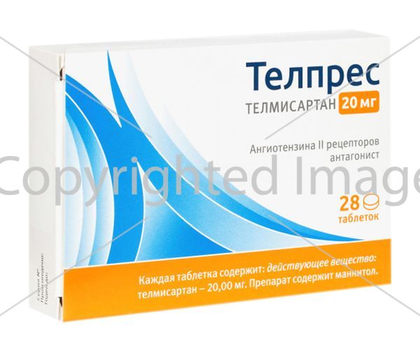 Склад, форма випуску та упаковкаТаблетка - 1 таб. Діючі речовини: гідрохлортіазид – 25 мг, телмісартан – 80 мг. Допоміжні речовини: маннітол - 327.7 мг, повідон К25 - 21.6 мг, кросповідон - 12 мг, магнію стеарат - 9 мг, меглюмін - 24 мг, натрію гідроксид - 6.7 мг, лактози моногідрат - 99.67 мг, 4 6 мг, карбоксиметилкрохмаль натрію (тип А) – 4 мг, заліза оксид жовтий (Е172) – 0.33 мг. Пігулки 25 мг + 80 мг. В упаковці 98 пігулок.Опис лікарської формиКруглі двоопуклі двошарові таблетки, один шар білого кольору, інший шар жовтого кольору.ФармакокінетикаСпільне застосування телмісартану та гідрохлортіазиду не впливає на фармакокінетику кожного з компонентів препарату. Телмісартан: Всмоктування: При прийомі внутрішньо швидко всмоктується із шлунково-кишкового тракту. Біодоступність становить близько 50%. При вживанні одночасно з їжею зниження AUC (площа під кривою "концентрація-час") коливається від 6% (при дозі 40 мг) до 19% (при дозі 160 мг). Через 3 години після прийому концентрація в плазмі крові вирівнюється незалежно від прийому їжі. Розподіл: Зв'язок з білками плазми крові – 99,5%, в основному з альбуміном та альфа-1 глікопротеїном. Середнє значення видимого обсягу розподілу у рівноважній концентрації – 500 л. Метаболізм: Метаболізується шляхом кон'югування з глюкуроновою кислотою. Метаболіти фармакологічно неактивні. Виведення: Період напіввиведення (Т1/2) – понад 20 год. Виводиться через кишечник у незміненому вигляді, виведення нирками – менше 2% від прийнятої дози. Загальний плазмовий кліренс високий (900 мл/хв) порівняно з "печінковим кровотоком" (близько 1500 мл/хв). Фармакокінетика у спеціальних груп пацієнтів: Гендерні відмінності: Спостерігається різниця у плазмових концентраціях у чоловіків та жінок. З m ах (максимальна концентрація) та AUC були приблизно у 3 та 2 рази, відповідно, вище у жінок порівняно з чоловіками без значного впливу на ефективність. Корекція доз не потрібна. Літні пацієнти: Фармакокінетика телмісартану у пацієнтів похилого віку не відрізняється від молодих пацієнтів. Корекція доз не потрібна. Пацієнти з порушенням функції нирок: У пацієнтів з легким та помірним порушенням функції нирок корекції дози телмісартану не потрібно. Пацієнтам з тяжкою нирковою недостатністю та пацієнтам, які перебувають на гемодіалізі, рекомендована нижча початкова доза – 20 мг на добу. Телмісартан не виводиться за допомогою гемодіалізу. Пацієнти з порушенням функції печінки: Дослідження фармакокінетики у пацієнтів із печінковою недостатністю показали збільшення абсолютної біодоступності телмісартану практично до 100%. При печінковій недостатності Т1/2 не змінюється. У пацієнтів з легкими та помірними порушеннями функції печінки (клас А та В за шкалою Чайлд-П'ю) добова доза препарату не повинна перевищувати 40 мг. Гідрохлортіазид: Після внутрішнього застосування Телпрес Плюс максимальні концентрації гідрохлортіазиду в плазмі досягаються протягом 1-3 годин. Абсолютна біодоступність, що базується на загальній екскреції нирками, становить близько 60%. Зв'язується білками плазми 64% гідрохлортіазиду, а об'єм розподілу 0,8±0,3 л/кг. Гідрохлортіазид не метаболізується в організмі та виводиться нирками практично у незміненому вигляді. Близько 60% дози, прийнятої внутрішньо, елімінується протягом 48 годин. Нирковий кліренс близько 250-300 мл/хв. Т1/2 гідрохлортіазиду – 10-15 годин. Спосте