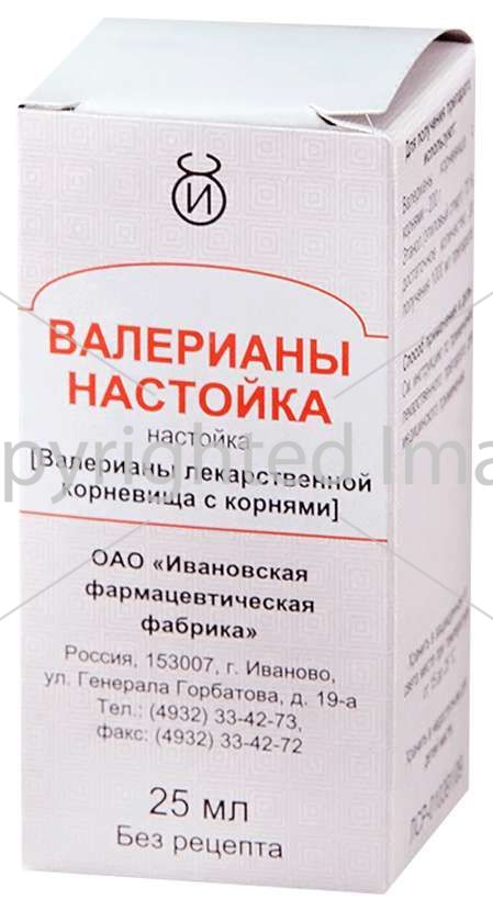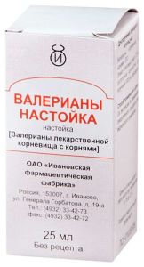 діюча речовина: настойка подрібнених кореневищ з корінням валеріани (200 г рослинної сировини на 1 л настойки) 25 мл. Екстрагент: етанол 70%.25 мл – флакони темного скла (1) – пачки картонні.