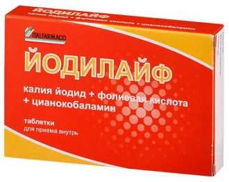 Таблетки – 1 таб.: калію йодид 262 мкг, у т.ч. йод 200 мкг, фолієва кислота 0.4 мг, ціанокобаламін (віт. B12) 0.002 мг.